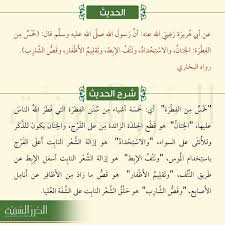 خمسة من الفطرة. ومعناه أنها من سنن الأنبياء صلوات الله وسلامه عليهم وقيل. خ م س م ن ال ف ط ر ة الا س ت ح د اد و ال خ ت ان و ق ص. هذا الحديث صحيح عن رسول الله عليه الصلاة والسلام رواه الشيخان البخاري ومسلم في الصحيحين عن أبي هريرة أن النبي عليه السلام قال.